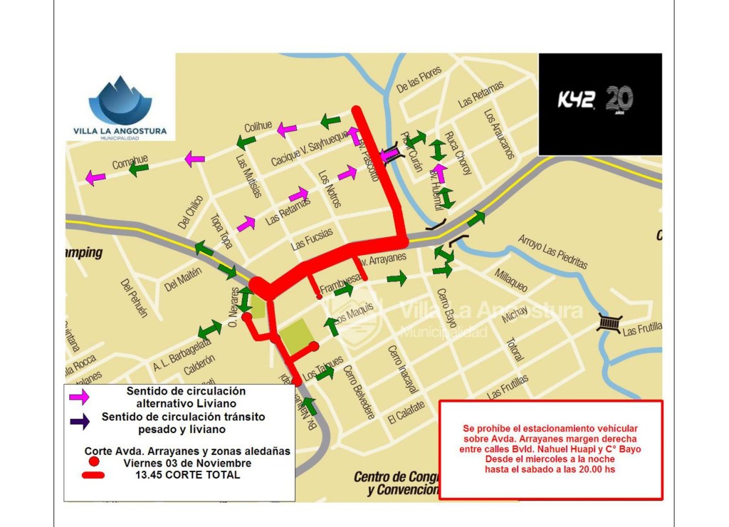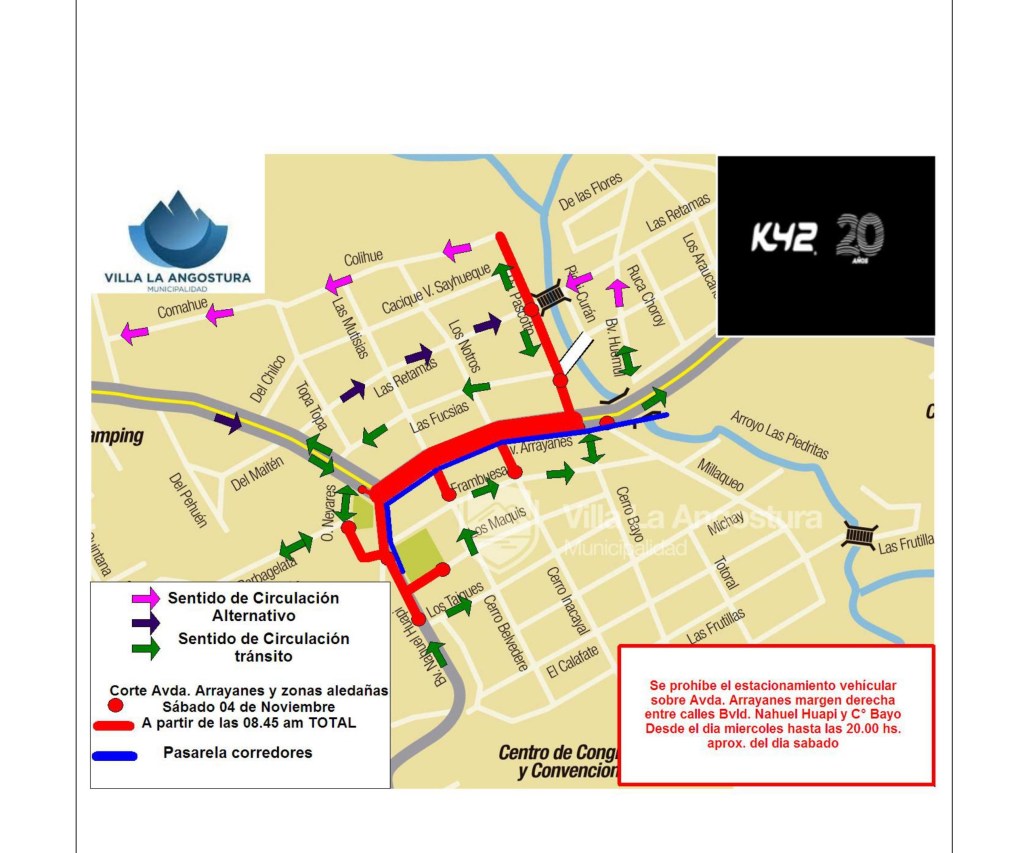 A partir de las 20.00 horas, del día miércoles 1 de noviembre, se prohíbe el estacionamiento sobre margen derecha de Avenida Arrayanes en dirección hacia San Carlos de Bariloche, hasta el día sábado 21.00 aproximadamente.