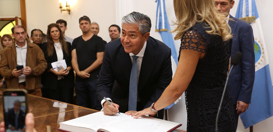 Previamente, en Salón de Acuerdos de la Casa de Gobierno, recibió el traspaso de la titularidad del Poder Ejecutivo por parte del gobernador saliente, Omar Gutiérrez, con la correspondiente firma del acta que estuvo a cargo de la escribana general de Gobierno, Laura Miranda.