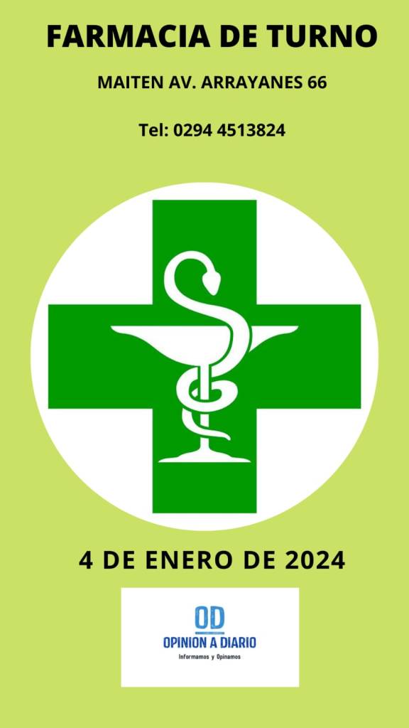 4 de enero, 2024 Opinión a Diario Farmacia de turno para hoy, Jueves 4 de Enero en Villa la Angostura, Neuquen. Relacionado
