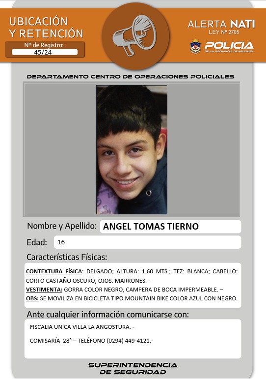 La policía del Neuquen lanzo el alerta NATI para Ángel Tomas Tierno, de Villa la Angostura. con las siguientes características la orden es para Ubicación y retención.