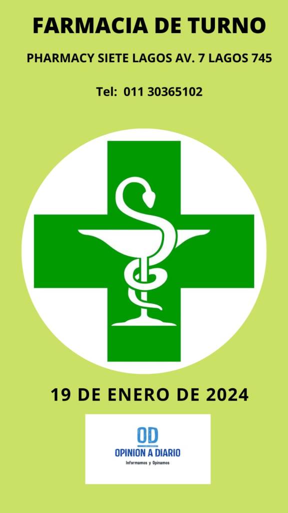 19 de enero, 2024 Opinión a Diario Farmacia de Turno para hoy, Viernes 19 de Enero en Villa la Angostura, Neuquen. Relacionado