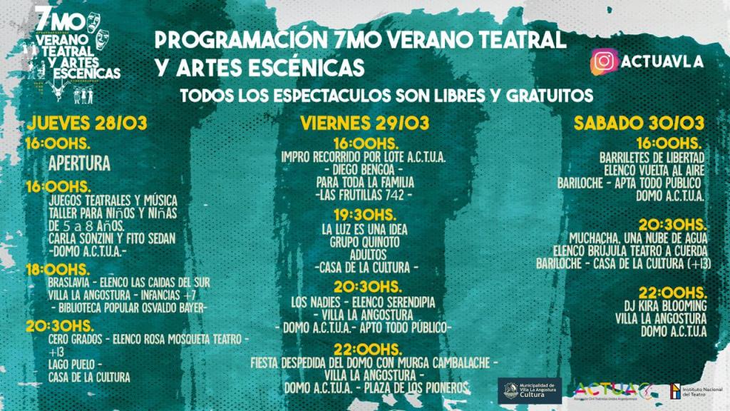 La gente de Actúa VLA, comparte con nosotros la info y la programación del 7 verano teatral y artes escénicas de Angostura. Ideal para los que nos visitan y para los locales, amplia oferta, horarios y lugares donde disfrutar las obras.