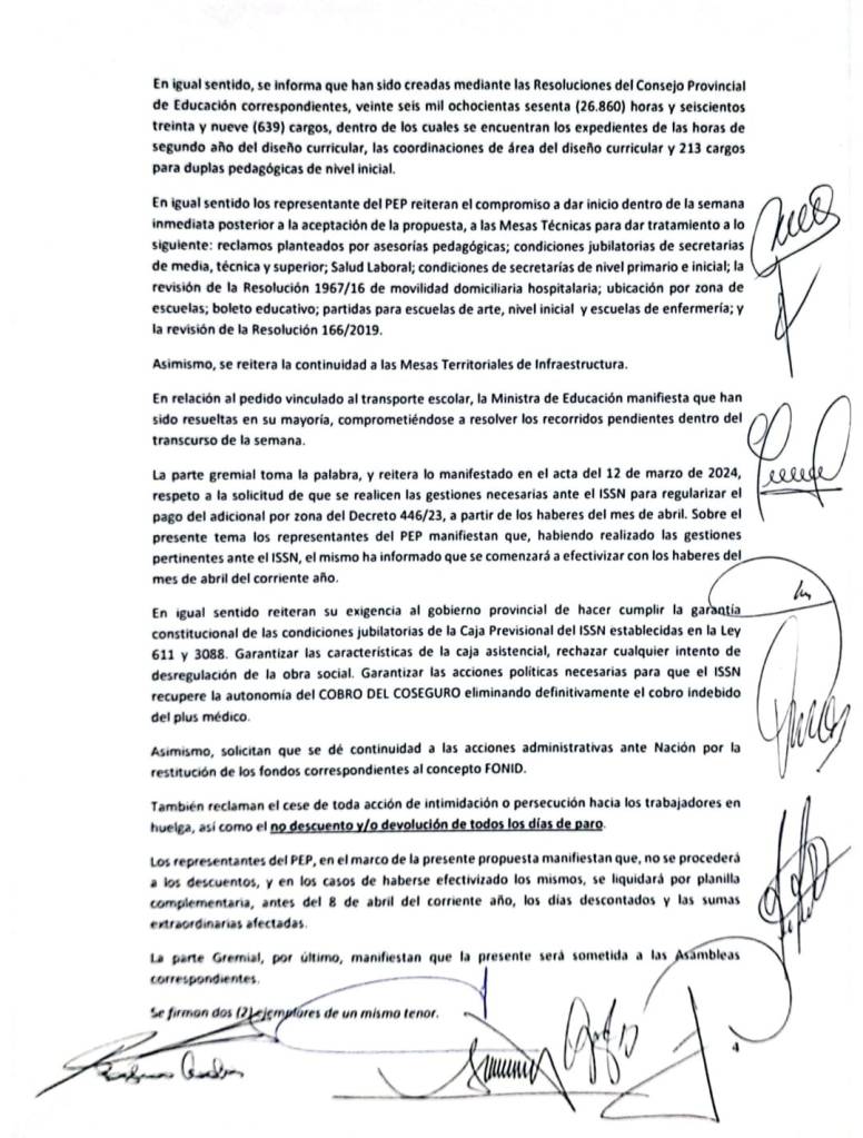 Desde el Ejecutivo provincial, recordaron que, en caso de arribarse a un acuerdo, no se procederá a los descuentos de días y se liquidarán por planilla complementaria en el caso de haberse efectivizado antes del 8 de abril. Lo mismo sucederá con las sumas extraordinarias afectadas.