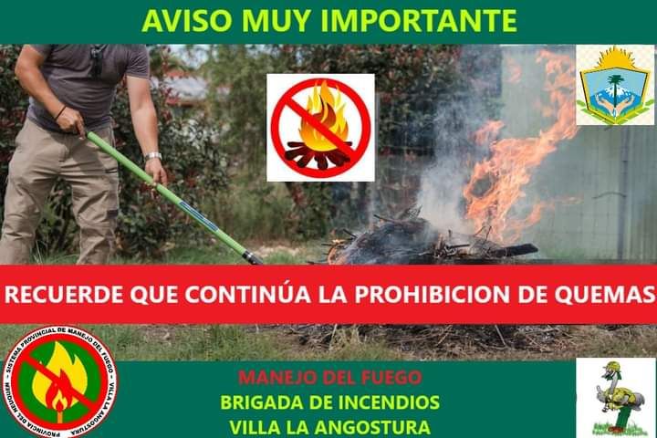 Desde el S.P.M.F Villa la Angostura, hacemos llegar la información ante varias consultas sobre las quemas, que continuamos con la veda de quema en nuestra localidad, hasta nuevo aviso! En cuanto tengamos información sobre la habilitación daremos a conocer la misma, en los medios de comunicación y nuestras redes. Por el momento continúan SUSPENDIDAS!!!