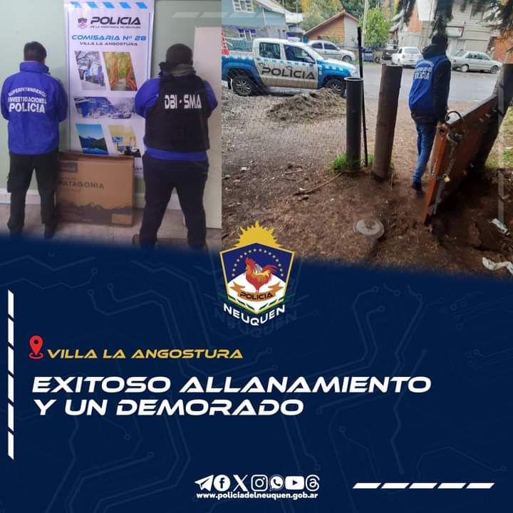 Villa La Angostura: En la jornada de ayer (25/04), personal de Comisaría N°28 con la colaboración de personal de la División Brigada de Investigaciones Zona Sur llevó a cabo una diligencia judicial en el marco de una investigación por hurto que, permitió recuperar un calefactor y demorar a un joven.