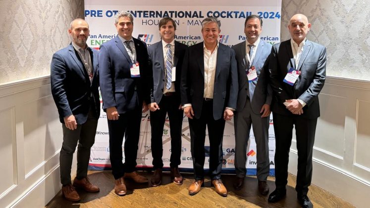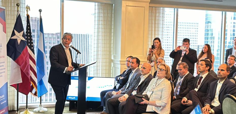 Antes de la presentación, Figueroa se reunió con los organizadores: Esteban Sánchez, Mariano Hasperue y Ariel Bossio, de la Cámara Argentino Texana; También participaron Daniel Feliciy Marcelo Gioffre, de Pan American Energy.
