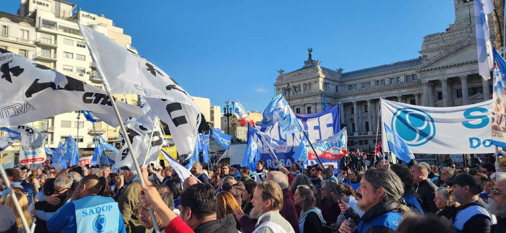 Antes de finalizar el acto, las y los docentes marcharon con una bandera Argentina de 50 metros frente al Congreso de la Nación para hacer oír el justo reclamo de la docencia.