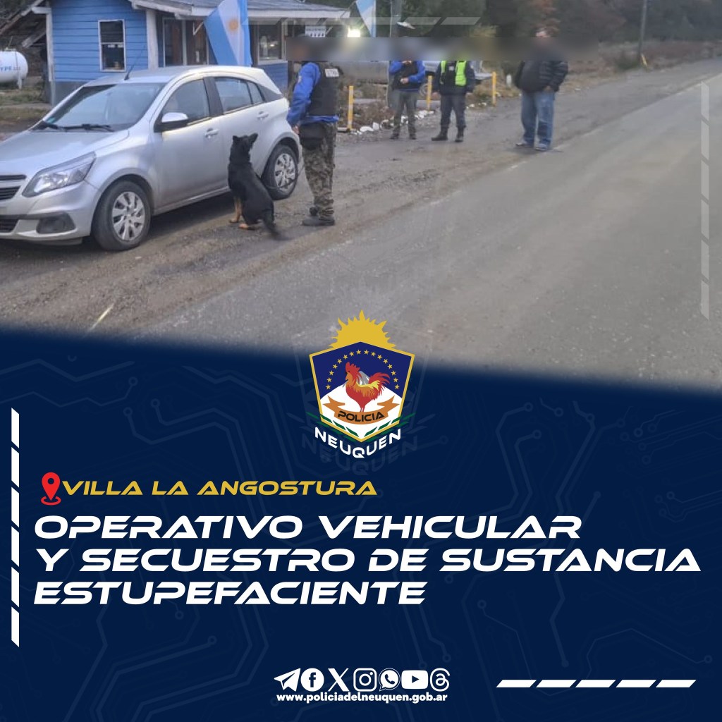 El operativo se realizó en el denominado Puesto Muelle de Piedra, Ruta Nacional 40, donde el personal policial procedió a verificar un vehículo Chevrolet Agile, conducido por una mujer de 27 años y al acercar al Can detector de la División Antinarcóticos al vehículo, este realizó un marcaje pasivo; logrando así el secuestro de 6 gramos de cannabis sativa y la notificación de la libertad supeditada a la causa a la conductora del vehículo, segun lo dispusiera la justicia.