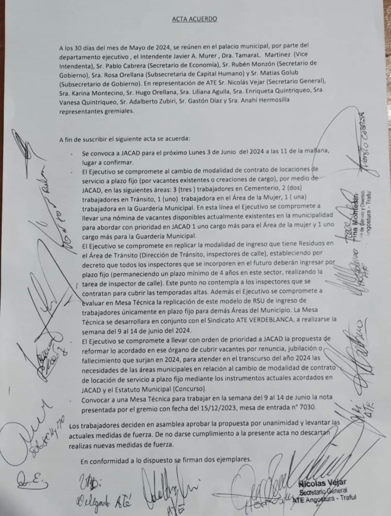 El acuerdo celebrado por el Ejecutivo Municipal de VLA y el Gremio ATE el día de ayer, 30 de Mayo de 2024 es ilegal. Sostengo esto porque el concepto de ilegal se emplea para hacer referencia a lo que resulta contrario a lo establecido por la ley. Es decir, es aquello que contradice o que no respeta lo fijado mediante la legislación.