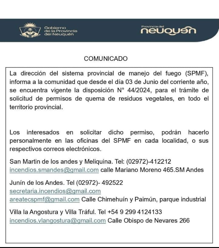 En Angostura y Traful, se deberá solicitar el permiso en la calle Obispo de Nevares 266 o en el teléfono 299 4124 133 o correo electrónico a incendios.vlangostura@gmail.com