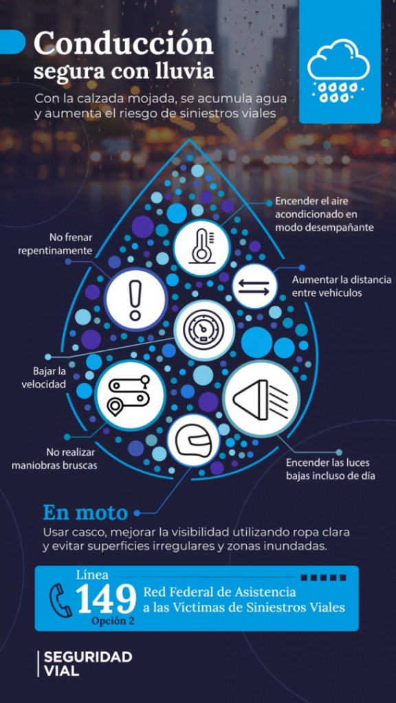 Los días de lluvias fuertes y tormentas mojan los caminos y acumulan agua sobre la calzada, situación que aumenta las probabilidades de protagonizar siniestros viales. Para evitarlos, es necesario que los conductores tengan presente qué maniobras pueden realizar para atenuar los riesgos y llegar seguros a destino.
