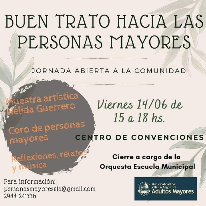 Desde el Área de Adultos/as Mayores, Secretaría de Desarrollo Humano, se invita a toda la comunidad a participar, este viernes 14 de junio de 15 a 18 horas, a una jornada especial en el Centro de Convenciones, enfocada en el buen trato hacia las personas mayores. Este evento está organizado en conmemoración del Día Internacional de la Prevención del Abuso y el Maltrato hacia las Personas Mayores, que se celebra el 15 de junio.