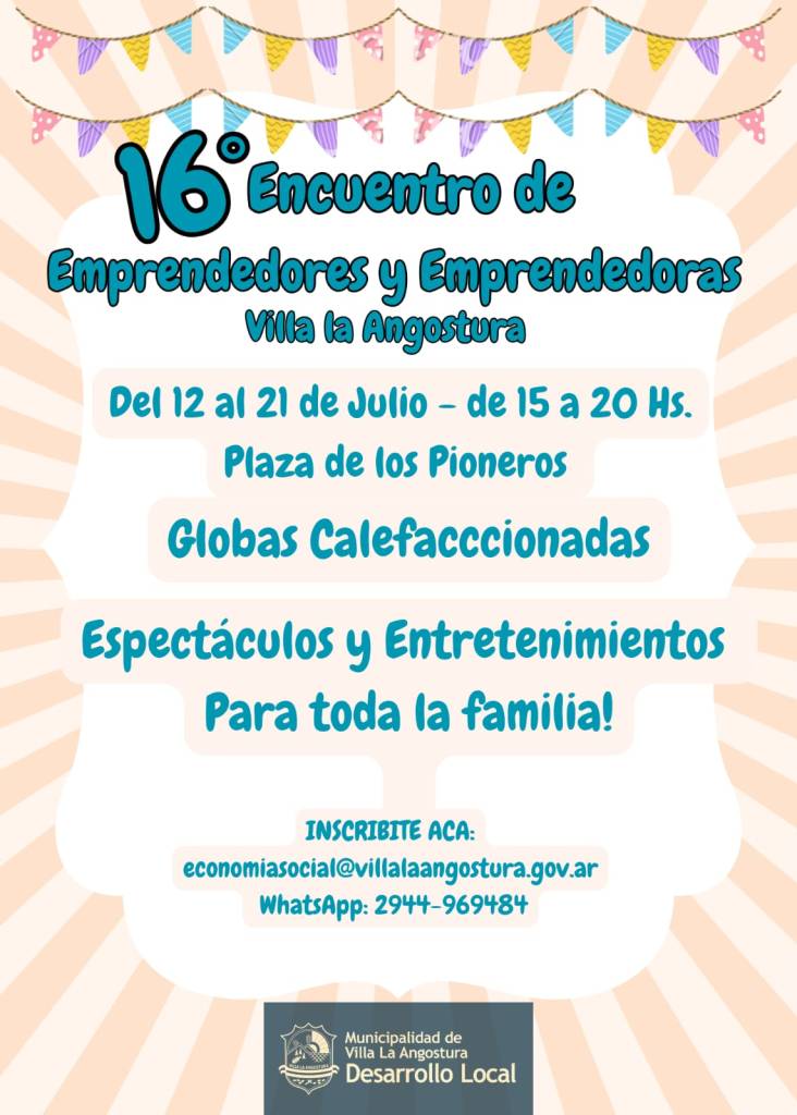 Dese Economía Social de Villa la Angostura, definen información, costos y formas de pago para los puestos de la Feria de Emprendedores y Emprendedoras. Correo electrónico y WhatsApp en imagen para inscribirse.