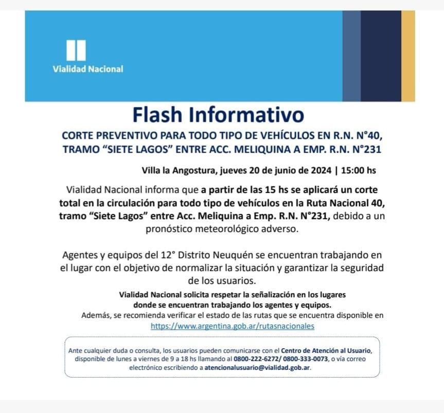 Vialidad Nacional informa que en la Ruta Nacional 40, entre Junin de los Andes y Pte. Rinconada, se restringirá la circulación de camiones y ómnibus durante las 20 hs del día de la fecha y las 8 hs del día de mañana, debido a un pronóstico meteorológico adverso.