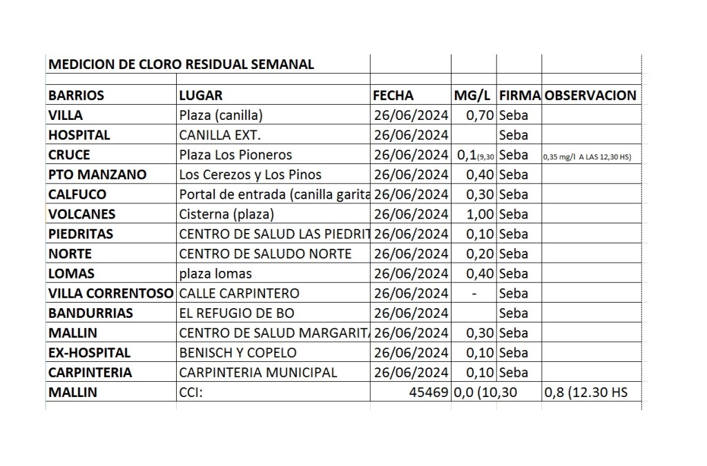 Mensualmente en conjunto con el Hospital Local, se toman muestras de agua en todos los Barrios para controlar que los niveles de cloro residual sean los correctos y estén dentro de los valores indicados 0,5 a 1,5ppm, estás muestras son llevadas al Laboratorio de Bromatología para corroborar valores, ajustarlos si es necesario y realizar análisis microbiológicos para descartar presencia de bacterias patógenas. Los resultados microbiológicos de los análisis realizados hasta ahora indican que el agua de red es potabilizada correctamente ya que no se detecta presencia de bacterias patógenas.