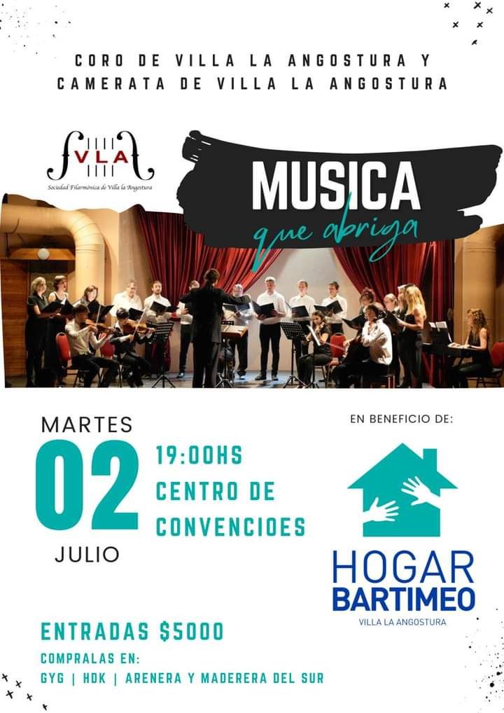El Coro de Villa La Angostura y la Camerata brindarán un concierto en el Centro de Convenciones el próximo martes 2 de julio. «Musica que Abriga» a total beneficio del Hogar Bartimeo. Las entradas anticipadas pueden adquirirse en comercios de la localidad y su costo es de $ 5000.-