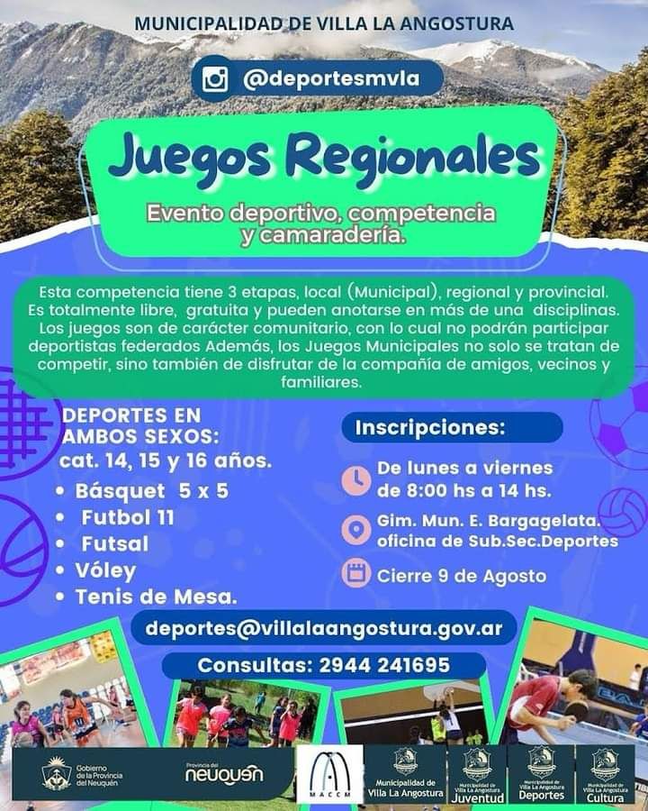 Esperamos contar con tu presencia y participación. Para más información y para inscribirte, podés hacerlo por correo electrónico a deportes@villalaangostura.gov.ar, por teléfono al +54 9 2944 241695, o en las oficinas de la Subsecretaría de Deportes Municipal.
