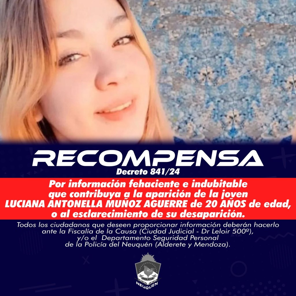 El Gobierno de la Provincia de Neuquén -a través del decreto 𝟴𝟒𝟏/𝟮𝟰- ofrece una recompensa pública por el monto de hasta 10 millones de pesos, a todas aquellas personas que aporten información fehaciente e indubitable que contribuya a la aparición 𝗟𝘂𝗰𝗶𝗮𝗻𝗮 𝗔𝗻𝘁𝗼𝗻𝗲𝗹𝗹𝗮 𝗠𝘂𝗻̃𝗼𝘇 𝗔𝗴𝘂𝗲𝗿𝗿𝗲 o al esclarecimiento de su desaparición.