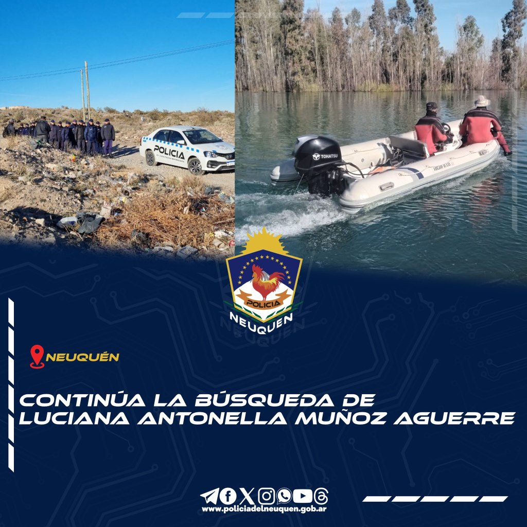 𝑪𝑶𝑵𝑻𝑰𝑵𝑼́𝑨 𝑳𝑨 𝑩𝑼́𝑺𝑸𝑼𝑬𝑫𝑨 𝑫𝑬 𝑳𝑼𝑪𝑰𝑨𝑵𝑨 𝑨𝑵𝑻𝑶𝑵𝑬𝑳𝑳𝑨 𝑴𝑼𝑵̃𝑶𝒁 𝑨𝑮𝑼𝑬𝑹𝑹𝑬. En el marco de la búsqueda de Luciana Antonella Muñoz Aguerre, de 20 años, personal policial llevó adelante un amplio operativo de rastrillaje en la meseta de Neuquén, barrios aledaños y en zonas del río Limay.
