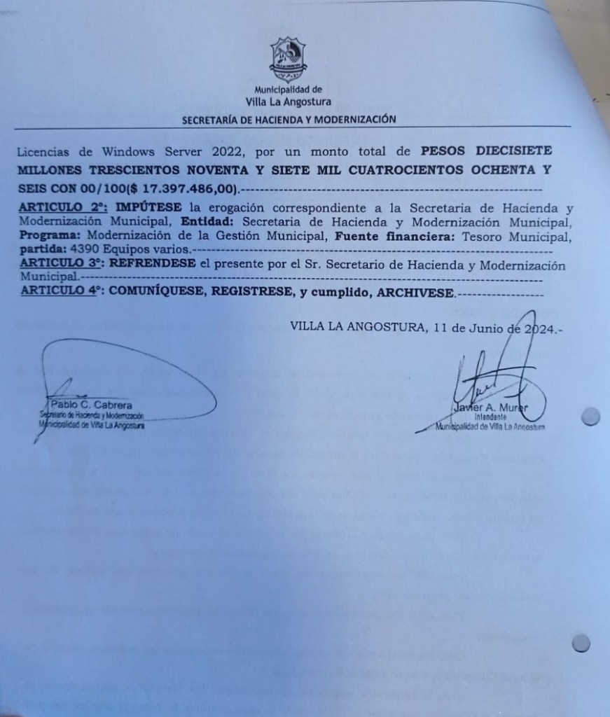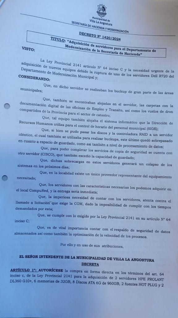 Los decretos en cuestión son 3 y son la compra de servidores y material para el área de informática de la municipalidad por de 17 millones 400 mil pesos.