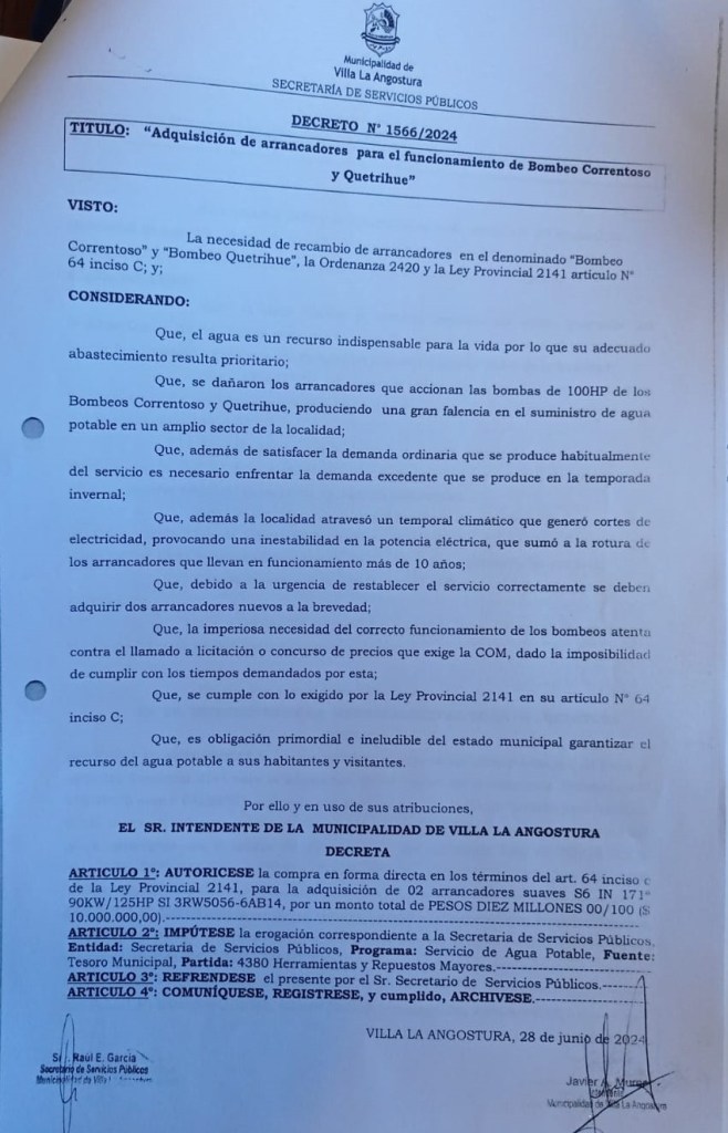Un decreto por una compra de 10 millones de pesos relacionadas con la compra de dos arrancadores para el área de agua potable.