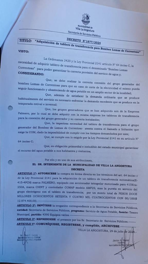 Por ultimo y también relacionado con el área de agua potable, un decreto por 12.874.000 pesos para la compra de un tablero de transferencia automático para el bombeo de lomas del correntoso.