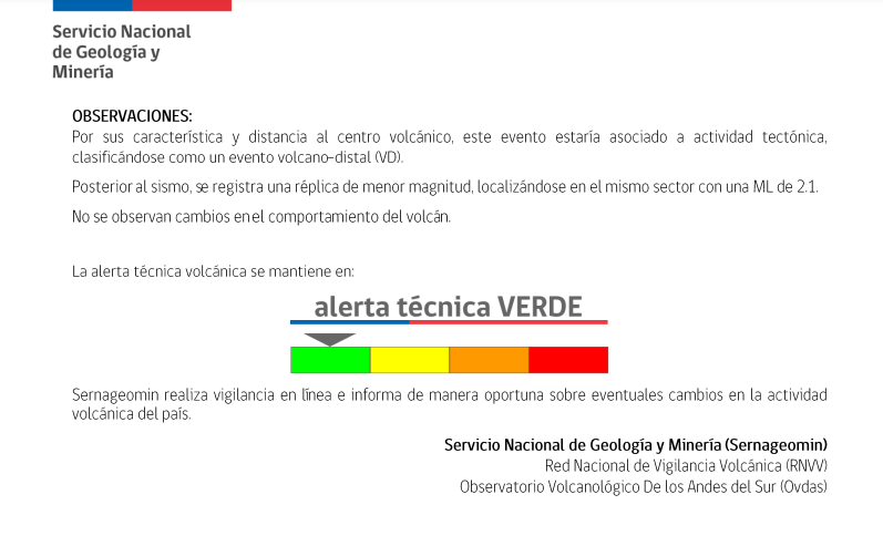 El evento registrado a las 1340 de ayer, fue calificado como un evento TECTONICO y fue calificado como un evento Vulcano Distal. fue registrada también una replica unos momentos después de menor intensidad y desde el organismo Chileno aseguran que siguen en linea el comportamiento del Volcán y que el alerta Técnica se Mantiene en Verde, ya que no se han registrado cambios en la actividad tectónica.