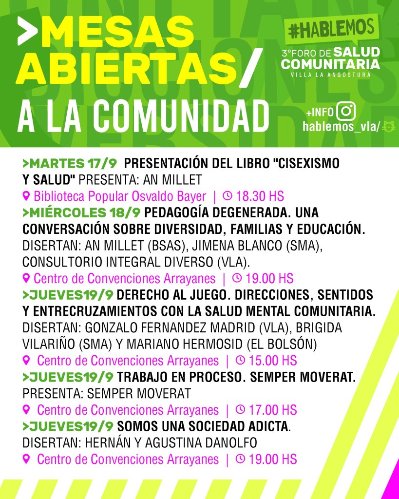 Este año, el 3er Foro de Salud Comunitaria #Hablemos abre sus puertas más amplias que nunca, invitando a toda la comunidad de Villa La Angostura a sumarse a una serie de eventos pensados para tener un mejor entendimiento y manejo de la salud mental y los consumos problemáticos.