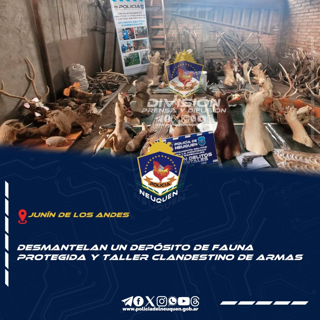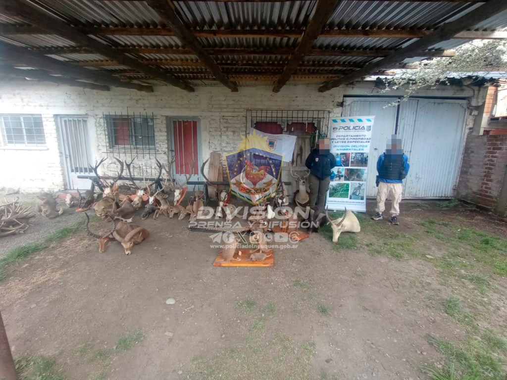 En un impactante operativo donde la policía del Neuquen en allanamientos en la ciudad de Junín de los andes, secuestraron distintos elementos relacionados con la caza furtiva como pieles, astas de ciervo, cabezas disecadas, huesos y hasta una fabrica de silenciadores para armas y material para relleno de municiones.
