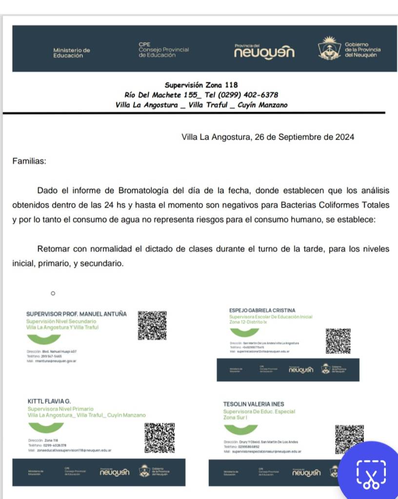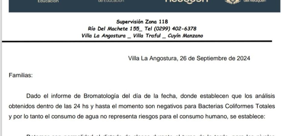 En un comunicado de prensa y basándose en los informes de Bromatología que confirman que el agua potable no representa riego microbiológico.