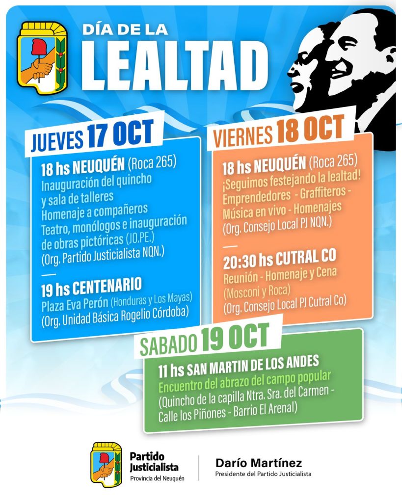 Neuquen capital y Centenario el 17, Neuquen y Cutral Co el Viernes 18 y San Martin de los Andes el Sábado 19 tendran distintas actividades y actos por el Dia que congrega a los peronistas en la Argentina.