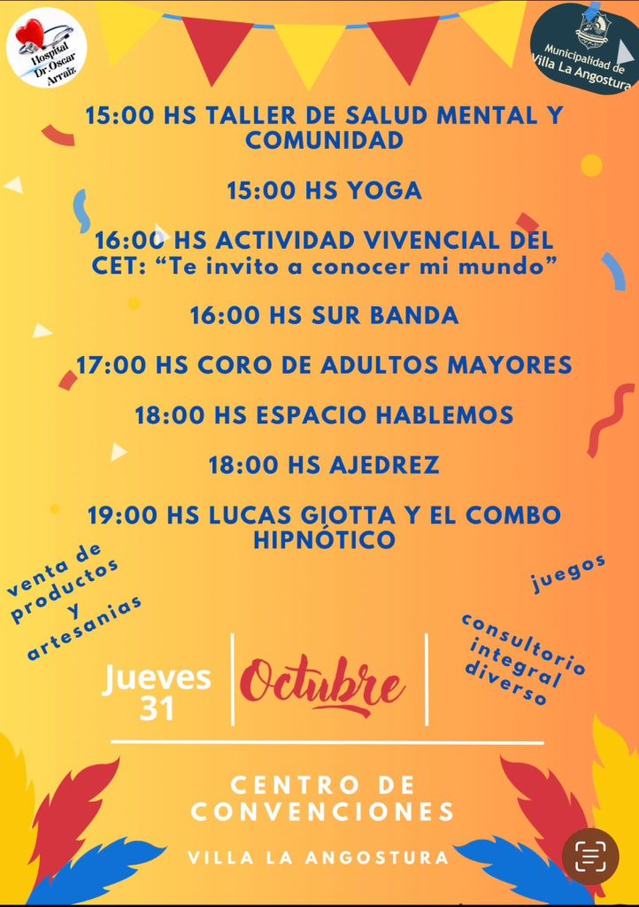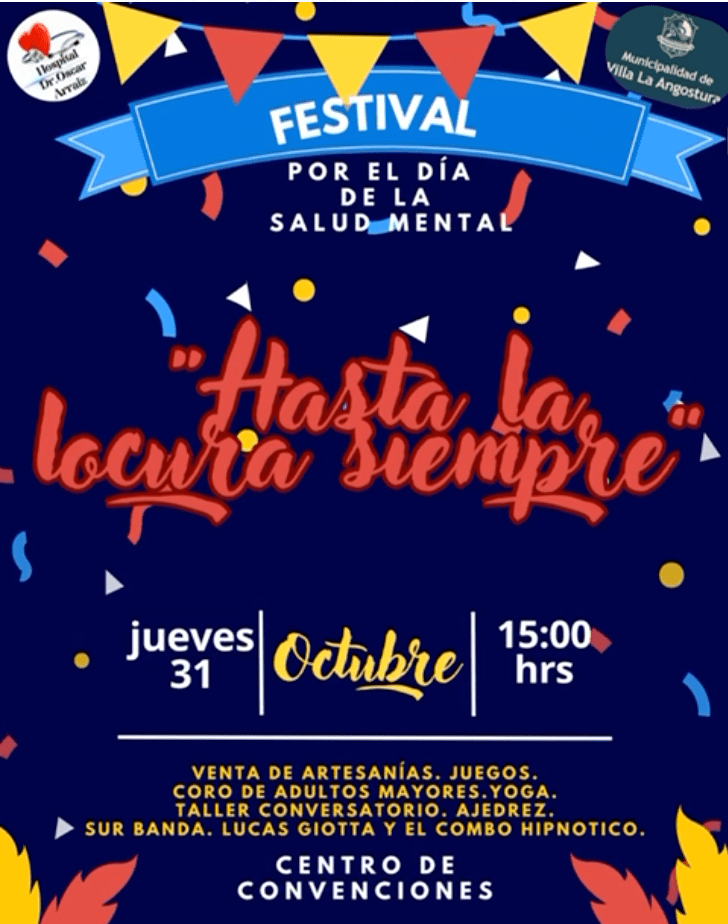 Para visibilizar y fortalecer esta visión, el equipo de salud mental del Hospital de Villa La Angostura, en colaboración con instituciones locales, organiza el Festival “Hasta la locura siempre” . Este evento se llevará a cabo mañana jueves 31 de octubre en el Centro de Convenciones, a partir de las 15 horas , y tiene como objetivo reunir a la comunidad en un espacio de sensibilización y defensa del derecho a la salud mental.