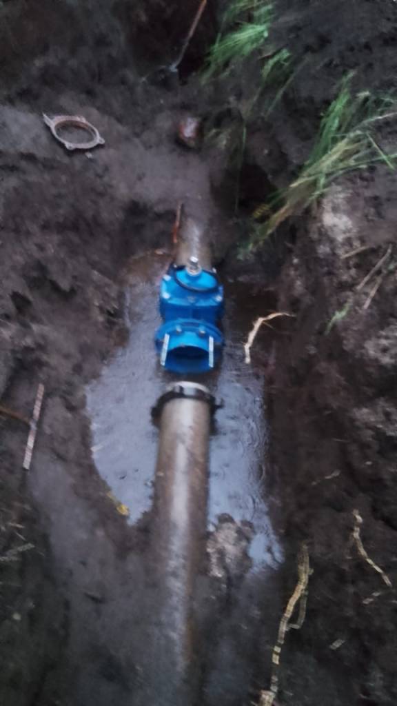 Finalmente en el día de ayer luego de tener que buscar un repuesto en San Carlos De Bariloche y bajo el agua, los empleados de Obras Publicas pudieron repara un caño maestro de los mas antiguos que había sido roto por un particular que manipulaba con una maquina un árbol y sus raíces en un terreno a la entrada de Barrio Norte.