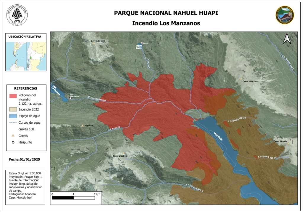 El Comité de Emergencia, coordinado por el Parque Nacional Nahuel Huapi y la Dirección de Lucha Contra Incendios Forestales y Emergencias, informa sobre el estado del incendio Los Manzanos y las tareas operativas y complementarias realizadas en la jornada de Ayer 1 de Enero.