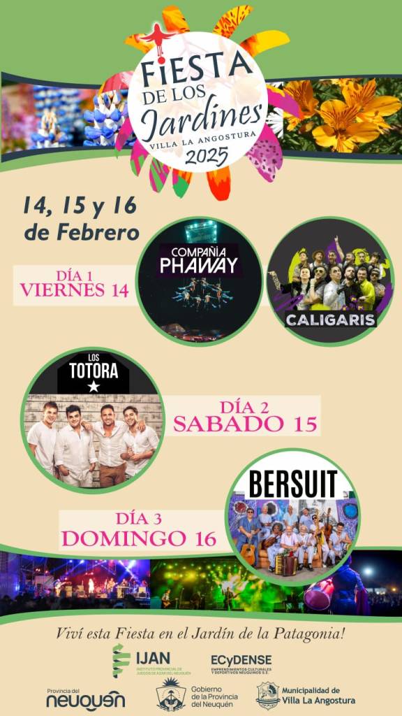 El día Viernes 14, Caligaris con Compañía Phaway arranca la fiesta de los jardines, siguiendo el Sábado 15 con Los Totora, cerrando la fiesta La Bersuit el día Domingo, que ya visitaron en otra oportunidad Villa la Angostura poniendo a Bailar a Muchísima gente una noche de mucha lluvia y frio.