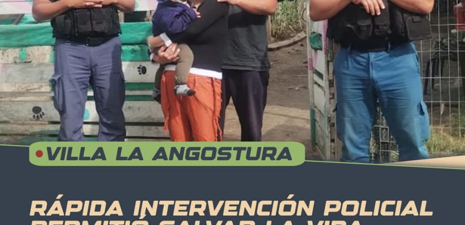 En la madrugada del día de hoy (13/01), un operativo preventivo de patrullaje llevado a cabo en Villa la Angostura, por el Oficial Horacio Zuñiga, el Cabo Benjamín Paredes y el Cabo Sergio Gil, permitió salvar la vida de un bebé de 1 año y meses, que se encontraba en grave peligro tras una convulsión por fiebre.