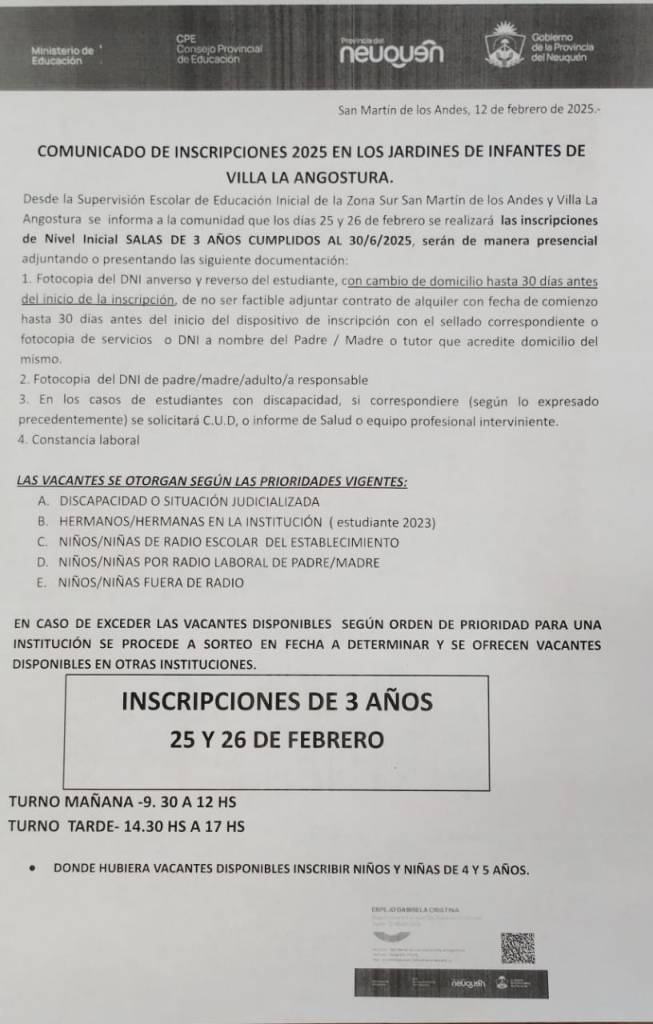 Desde la supervisión escolar de la zona sur de la provincia, convocan a los niños y niñas de 3 años a inscribirse a los Jardines de Infantes en Villa la Angostura.