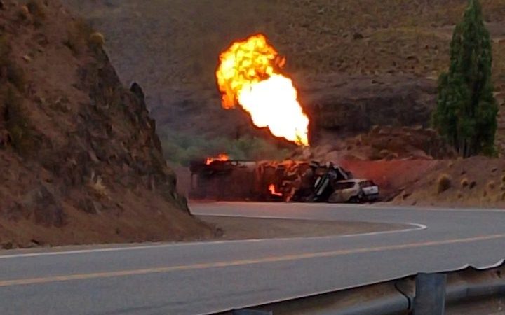 En la mañana del día de hoy domingo 23 seguían trabajando en el lugar del accidente entre un vehículo particular y un camión cisterna que transporta gas con destino a la aduana cardenal Samore.