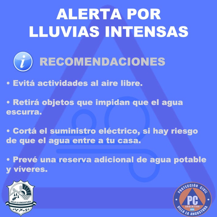 Desde el área del Municipio informaron de un Alerta Naranja para el día de Hoy en Villa la Angostura por Lluvias intensas, además recuerdan algunas recomendaciones para tener en cuenta.