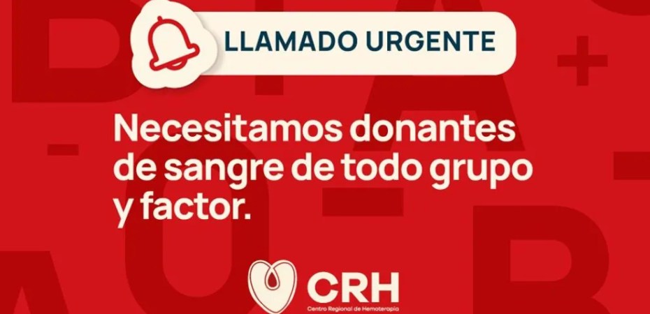 Desde el Centro Regional de Hemoterapia solicitan en forma urgente donantes de sangre de todos los grupos y factores. Además, se realizan colectas externas en distintas instituciones, pero en este momento los niveles de stock son bajos y por ese motivo se realiza un llamado urgente.