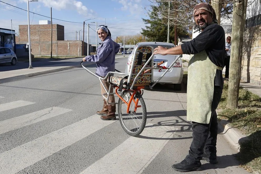 Fue entonces cuando su mirada pedagógica se cruzó con un nuevo oficio: la herrería. Mientras cursaba en el Centro de Formación Profesional Nº 14, construyó un monociclo con una silla adaptada para senderismo. “¿Por qué no construirlo si yo también estoy aprendiendo?”, se preguntó. Así nació un proyecto con corazón y materiales reciclados: “Reciclamos hierros, metales, bicicletas que me donaban, mesas de escuela rotas”, enumeró. Con ayuda de su profesor Nelson Moraga y la colaboración de la comunidad, adaptó y fabricó un vehículo único, inspirado en otros modelos de monociclos como la Champa Bike o el modelo europeo Joëlette, pero hecho con manos neuquinas.