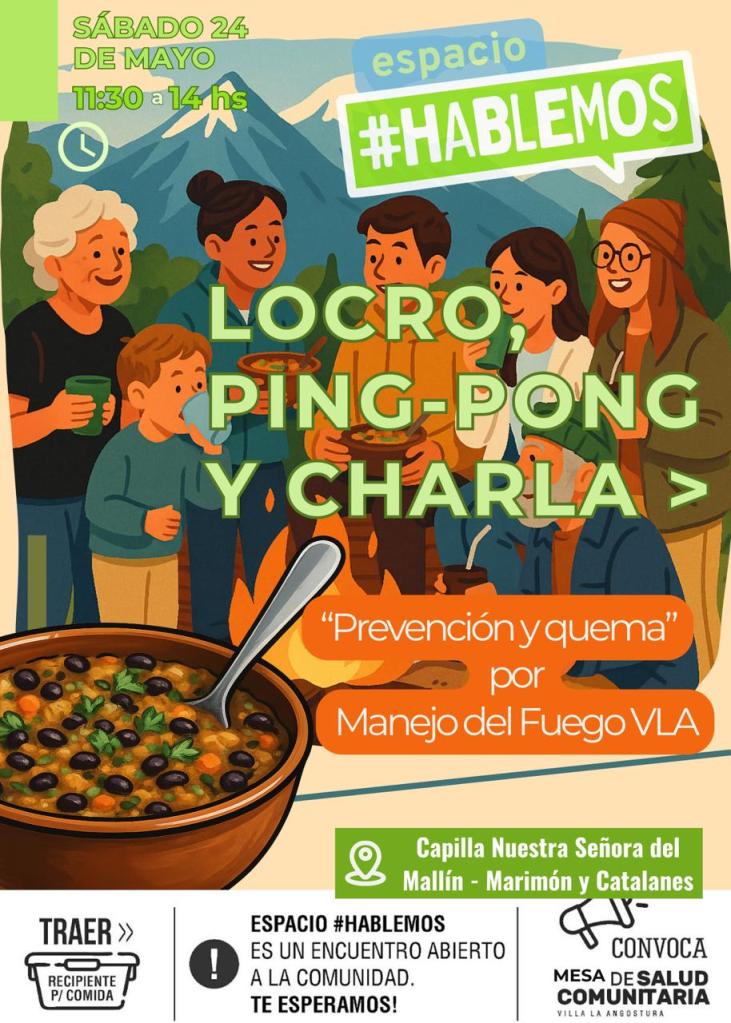La Brigada de Incendios Forestales invita a los Angosturenses que se acerquen a la Capilla Nuestra Señora del Mallín, el Sábado 24 podes comprar tu porción de Locro, Jugar al Ping Pong y además aprender campo prevenir incendios forestales y realizar quemas seguras.