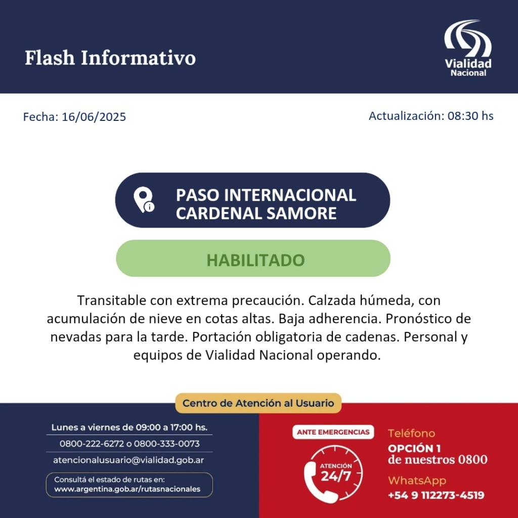 Parte de rutas del Plan Invernal de Vialidad Nacional, Paso a Chile, RN 231:Cardenal Samore, calzada húmeda.