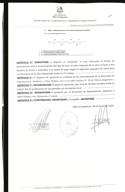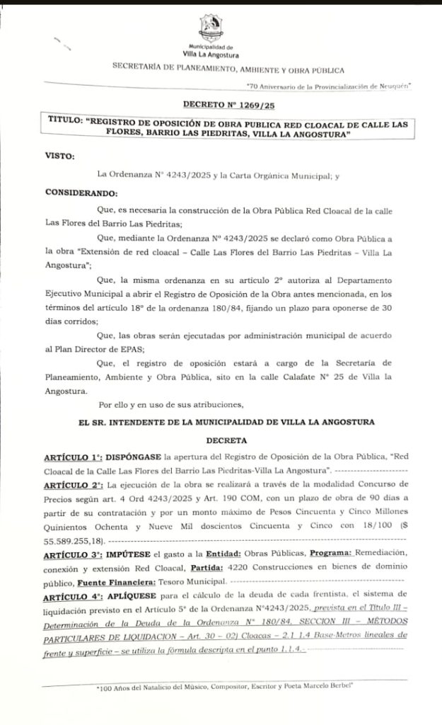 La Municipalidad de Villa La Angostura, informa a la comunidad que según establece el Decreto N° 1269/2025, se abre el registro de oposición para la Obra Pública, “Red Cloacal Calle Las Flores del Barrio Las Piedritas – Villa La Angostura.