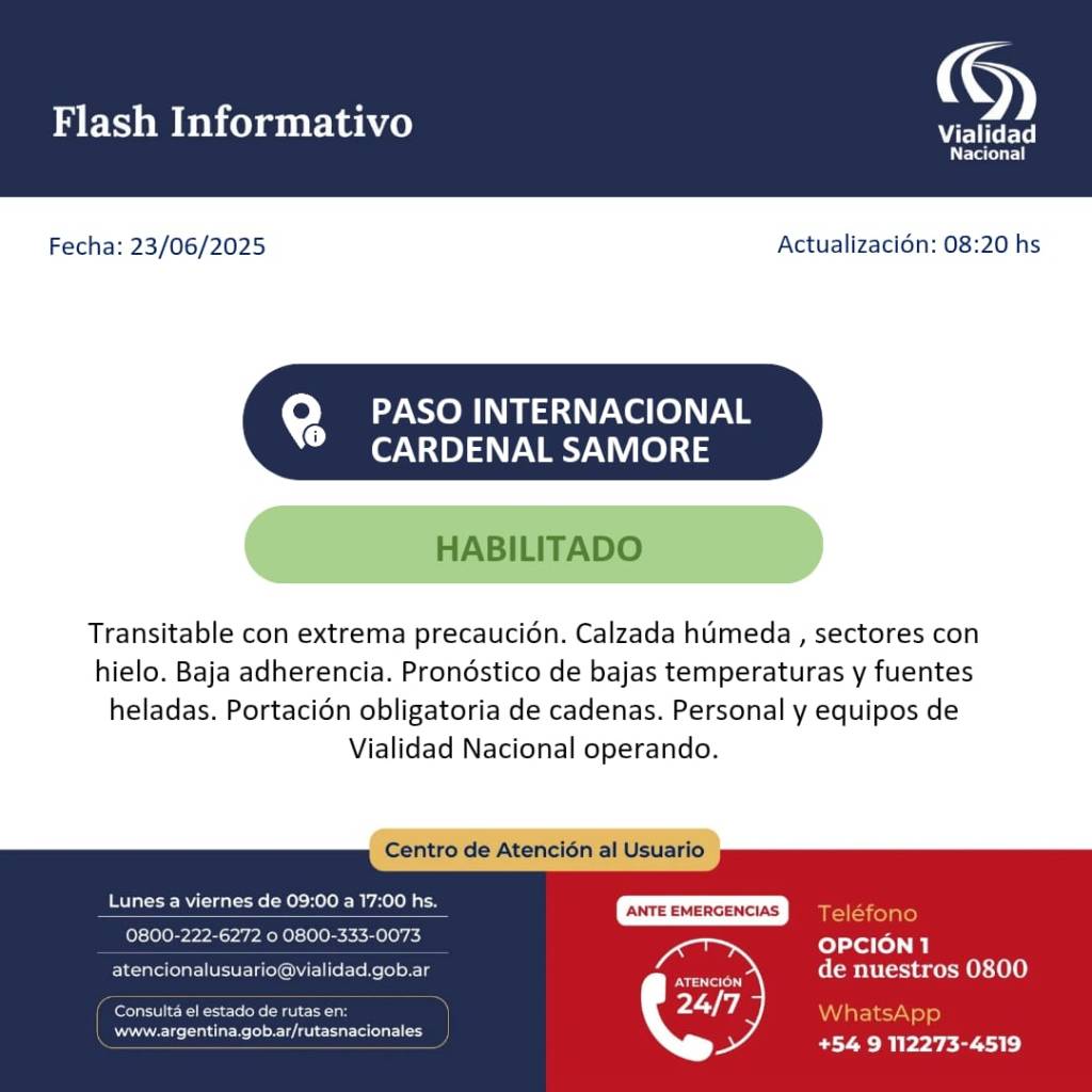 Parte de rutas del Plan Invernal de Vialidad Nacional RN 231: Cardenal Samore, Calzada húmeda, sectores con hielo.