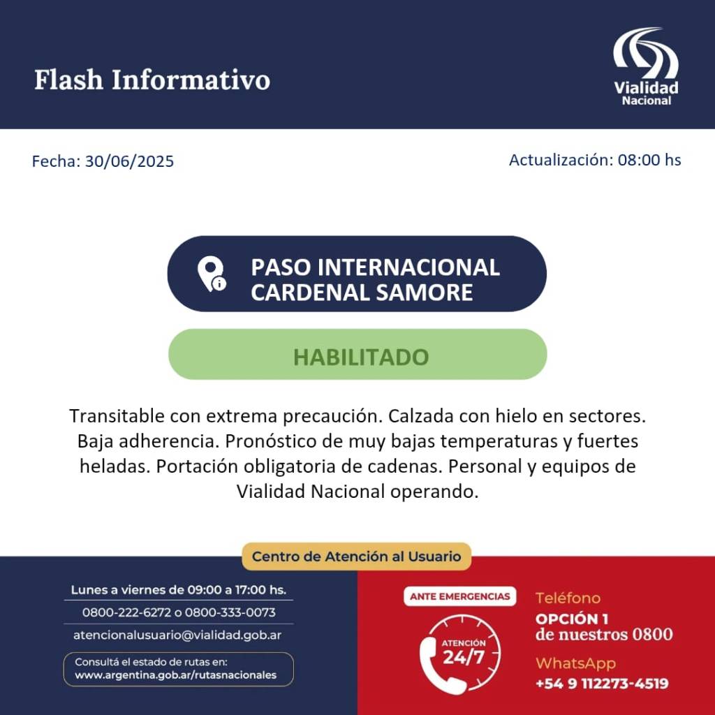 Parte de rutas del Plan Invernal de Vialidad Nacional, transitable con extrema precaución en todos los tramos. Sectores con hielo.