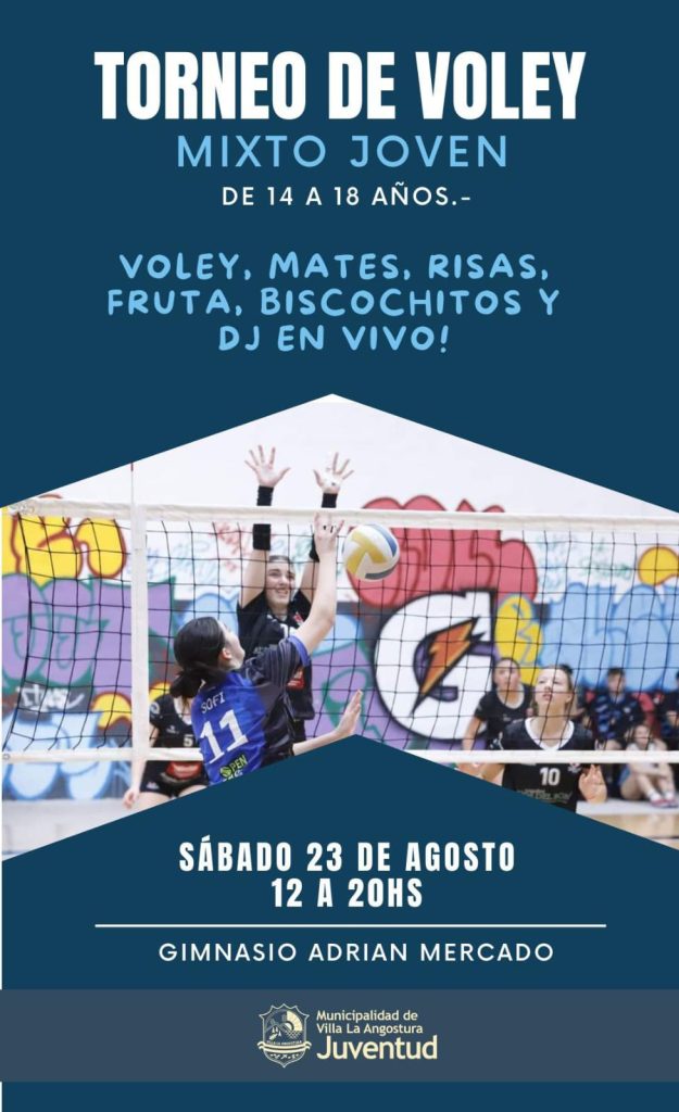 La Municipalidad de Villa La Angostura, a través del Área de Juventud de la Secretaría de Deportes, invita a los estudiantes de las escuelas secundarias de la localidad a participar en el Torneo de Vóley Mixto Joven, que se llevará a cabo el 23 de agosto en el Gimnasio Adrián Mercado.