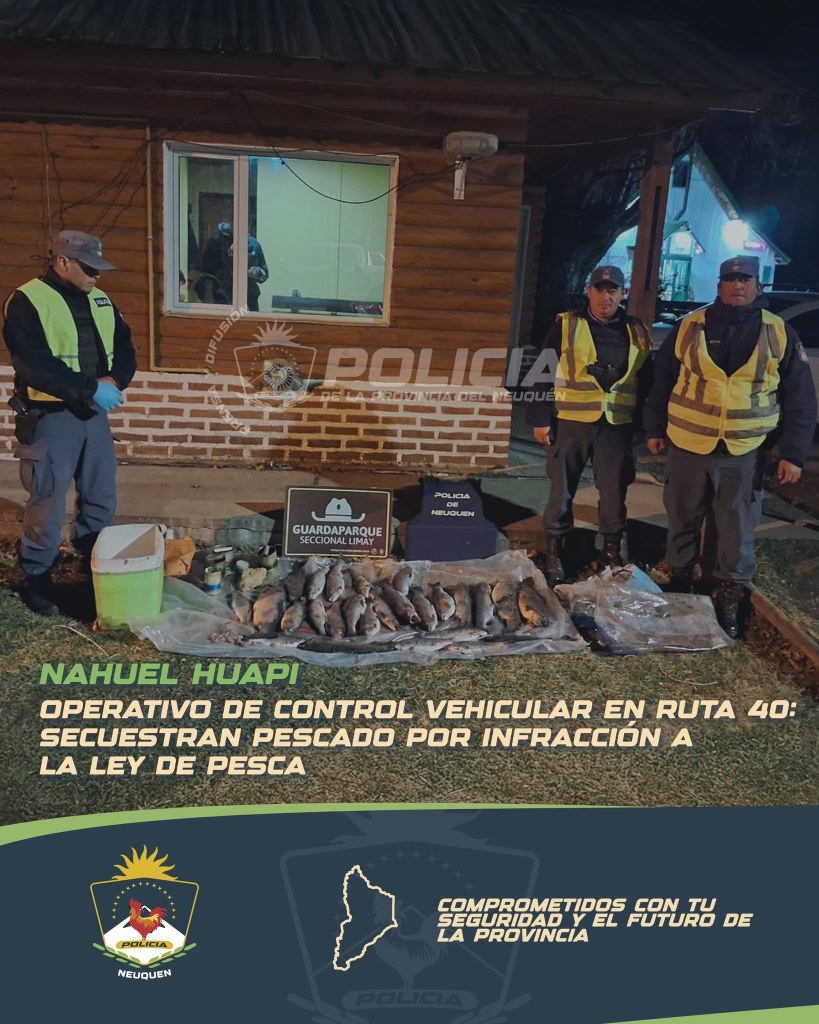 Ante esta situación, se solicitó la intervención de Parques Nacionales – Seccional Limay, cuyos agentes constataron que se trataba de 26 truchas y otros elementos de pesca. El hallazgo configuraba una infracción a la normativa vigente de pesca deportiva, por lo que se procedió al secuestro de los productos y equipos bajo acta correspondiente.