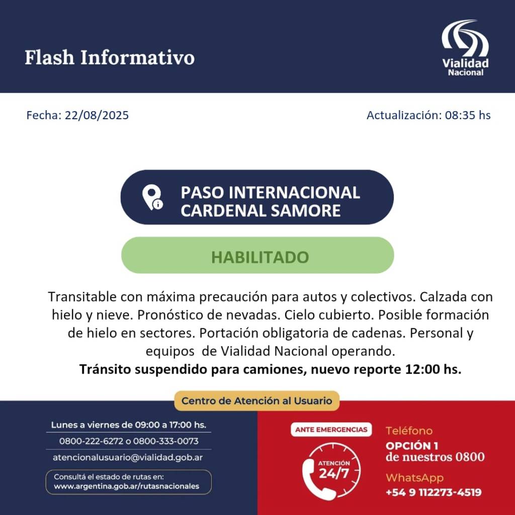 Todos los tramos se encuentran transitables con extrema precaución. Cardenal Samore: Habilitado para autos y colectivos, Suspendido para camiones, nuevo reporte 12:00 hs.