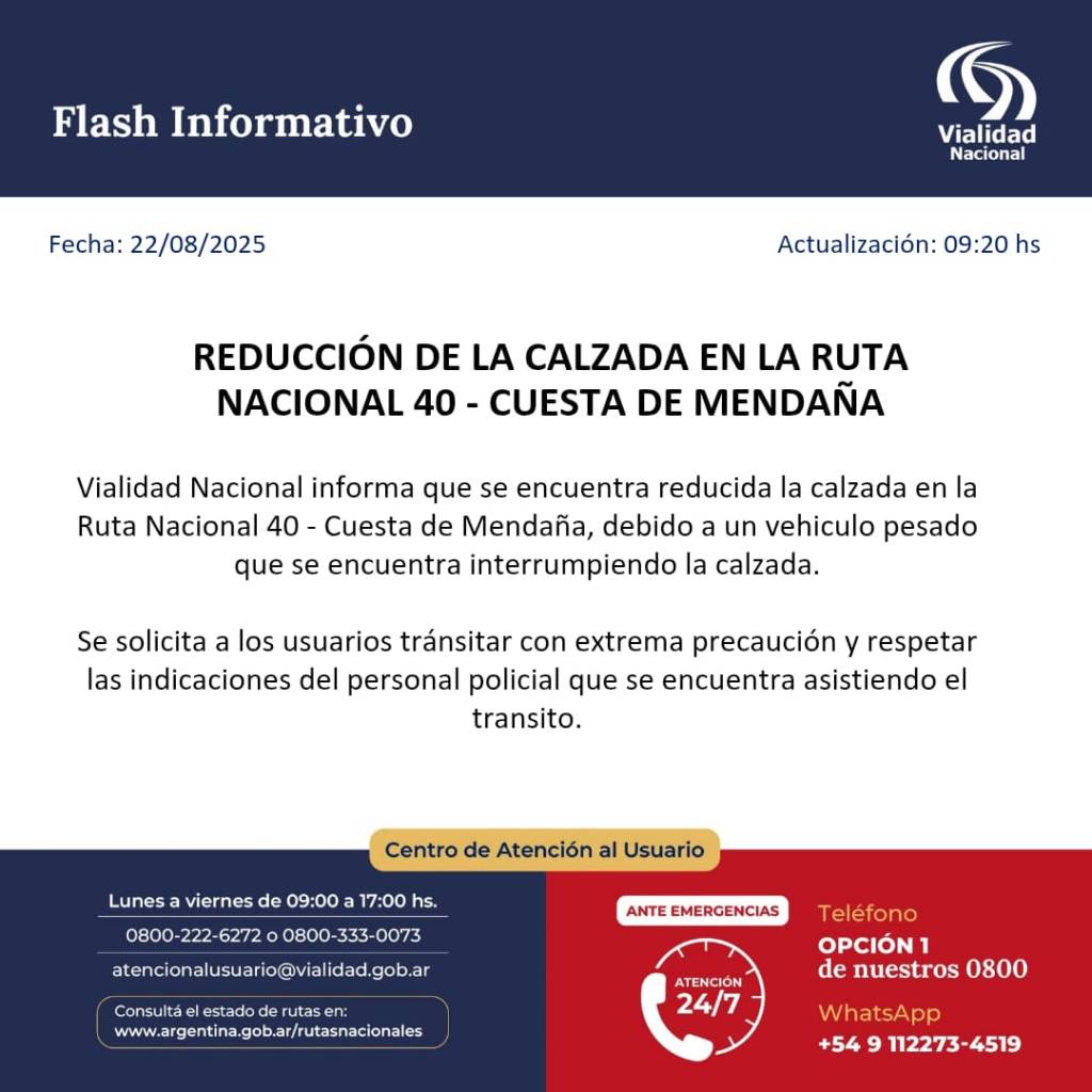 Parte de rutas del Plan Integral de Mantenimiento Invernal 2025 de Vialidad Nacional. Pronóstico de lluvia, aguanieve y nieve en la zona cordillerana, Pronóstico de viento en el centro y norte de la provincia hasta el 25/08.